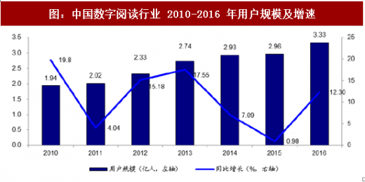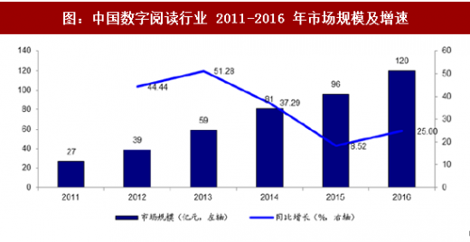 伴随着数字阅读风起,我国数字阅读行业用户数和市场规模稳步增长。据中国音像与数字出版协会发布的《2016 年度中国数字阅读白皮书》数据显示,2016 年我国数字阅读用户规模达3.33亿人,较2015年增长12.5%。进入行业高速发展期以来,2011-2016 年行业市场规模复合增速约 35%。2016 年我国数字阅读行业市场规模达 120 亿元。