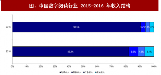 同时,行业的较快发展,也在不断催生出不同商业变现模式。2016 年,我国数字阅读行业收入结构虽然仍以订阅收入为主,但版权收入占总体收入同比增长近 1 倍,广告收入和其他收入占比也不断提升。未来,随着进一步的版权制度完善和行业空间扩展,数字阅读行业有望在商业模式上进行更多探索,并促进收入结构优化升级,打开增量市场空间。