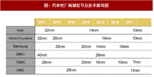 半导体工业不断突破制造极限。英特尔创始人戈登摩尔提出摩尔定律:当价格不变时,集成电路上可容纳的元器件数目,约每隔18-24个月便会增加一倍,性能也将提升一倍,从而要求集成电路尺寸不断变小。经过十几年的发展,我国集成电路制造企业的工艺水平已提升至28纳米,与先进水平的差距逐渐缩小。目前12英寸生产线的65/55纳米、45/40纳米、32/28纳米工艺产品已经量产;16/14纳米关键工艺技术已展开研发并取得一定的技术突破和成果;8英寸生产线的技术水平覆盖0.25微米一0.11微米。根据IC insights公布的技术路线图,国际龙头厂商对半导体工艺的研究已经到了10nm以下,而业内普遍认为5nm工艺将是极限,此时晶体管就只有10个原子大小,由于对物理极限的逼近使得开发难度大增。