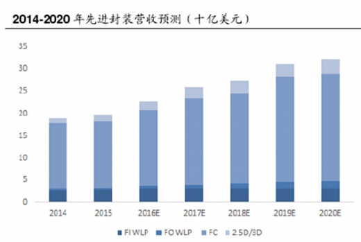 受益于 Fan-Out WLP 和 2.5D/3D 的大量应用,以及 Fan-In WLP 和 Flip-Chip的稳步增长,Yole 预测,先进封装市场营收将从 2014 年 192 亿美元增长到 2020年的 317 亿美元,复合年增率为 8%。先进封装目前占据整个封装市场的 38%市场份额,预计 2020 年将增长至 46%。
