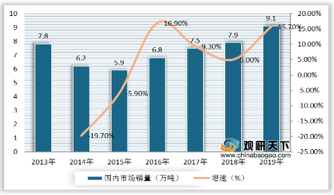同时,我国海绵钛销量也呈现逐年上升的趋势,2019年中国海绵钛销量达9.1万吨,较2018年增加1.2万吨,同比增长15.7%。
