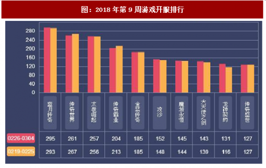 2018年第9周(2.26-3.4)开服前三页游为:恺英网络《蓝月传奇》、恺英网络《传奇世界》、三七互娱《太极崛起》。