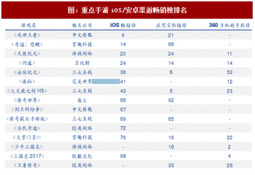 根据AppAnnie以及安卓应用商店2018年3月10日数据,重点手游排名iOS畅销榜排名前三位:《乱世王者》(第9名)、《奇迹:觉醒》(第14名)、《问道》(第24名),其他手游在iOS/安卓渠道畅销榜排名见下表: