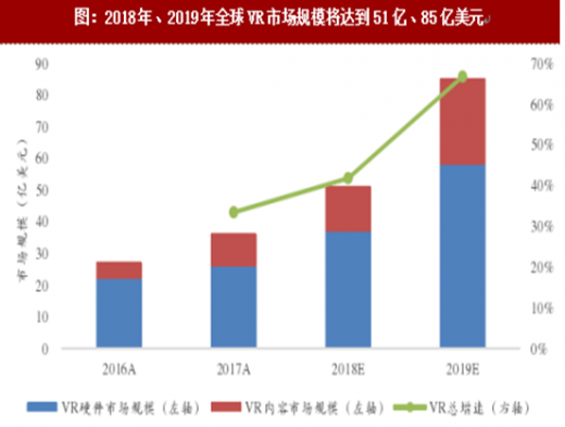 图:2018年、2019年全球VR市场规模将达到51亿、85亿美元