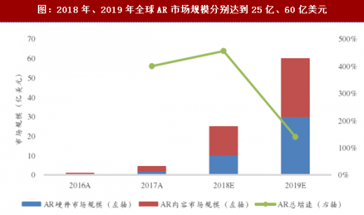 图:2018年、2019年全球AR市场规模分别达到25亿、60亿美元