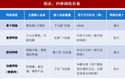 综上分析,网络价值的大小:移动通信网络>宽带网络>边缘网络(物联网)>骨干网络