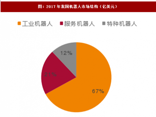 2017年,预计我国机器人市场规模将达到62.8亿美元,2012-2017年的平均增长率达到28%。其中,工业机器人42.2亿美元,服务机器人13.2亿美元,特种机器人7.4亿美元。