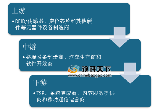 车联网产业链条较长,主要分为上游、中游和下游三个部分。 上游:主要包括 RFID/传感器、定位芯片和其他硬件等元器件设备制造商。 中游:主要包括终端设备制造商、汽车生产商和软件开发商。 下游:主要包括 TSP、系统集成商、内容服务提供商和移动通信运营商。