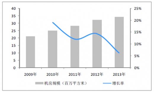 2009 年至2013 年间,全球数据中心的机房规模同样呈现了增长趋势。2013年,全球范围内数据中心的机房规模共计3,360 万平方米,同比增长3.7%,增长率放缓的原因在于许多成熟数据中心市场的机房规模增长率逐渐趋缓,其中部分国家在数据中心机房规模上出现了小幅下降。