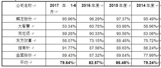 根据各公司公开披露资料,行业内可比公司的互联网金融信息服务业务的毛利率及平均毛利率水平情况如下表所示: