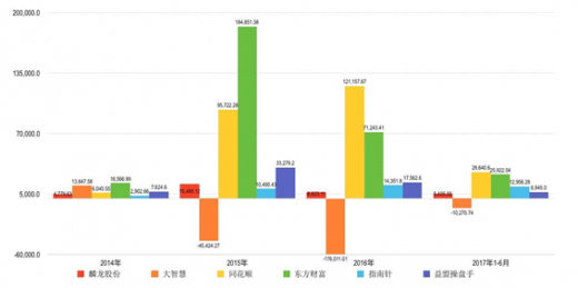 互联网金融信息服务行业已经经历了 20 多年的发展,目前市场中形成了以下竞争格局:大智慧、同花顺、东方财富等上市公司提供的互联网金融信息服务较为全面,服务趋于平台化,客户群体相对庞大;指南针、益盟股份、麟龙股份等公司的产品设计更具专业特色,技术指标独特,客户群体相对较小但有针对性。近三年及一期,行业内可比公司的互联网金融信息服务收入以及净利润情况如下表所示: