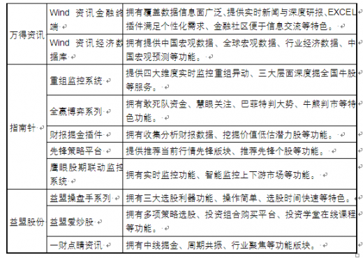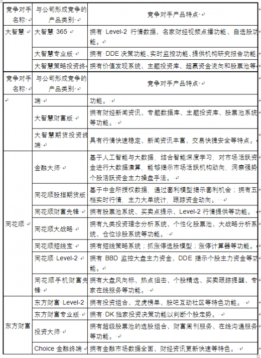 目前,主要竞争对手有大智慧、同花顺、东方财富、万得资讯、益盟股份、指南针。