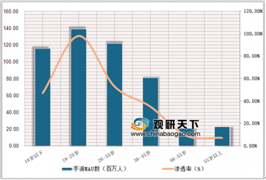 从游戏人口数量来看,我国接近23%的手游人口分布在18岁之下,而28%分布在18-25岁左右,25岁以下的手游人口占比超过了50%,我们倾向于这一数据或被高估,因为如果我们按照上述口径,当前的中国人口年龄分布计算可得在18岁以下,手游的渗透率达到47%左右,在18-25岁区间渗透率或达到100%,这显然是高估了这一人群的手游人口的。
