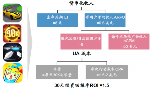 2019年以来超休闲游戏的最大变化并不是发生在流量端,而是随着用户规模的扩张之后形成了 广告 的规模效应,单元经济模型跑通。根据字节跳动此前在分享会上的披露,国内顶级超休闲游戏单个用户的生命周期约为8天,单个用户的ARPU约为0.6美元。