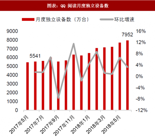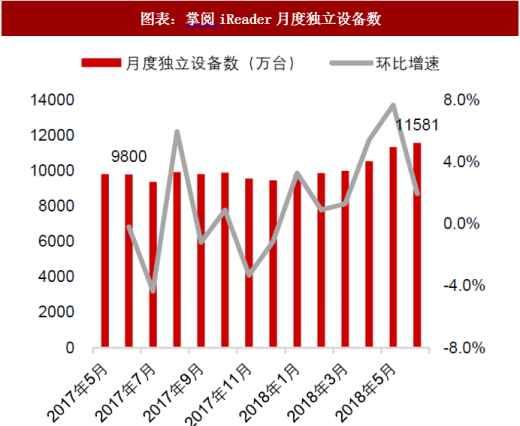 QQ 阅读、掌阅用户数恢复增长,相比 2017 年底增长超过 20%。2017 年下半年,以掌阅 iReader、 QQ 阅读为代表的数字阅读 APP 用户数、用户时长均出现增长停滞现象,引发投资者对数字阅读用户数的担忧。根据艾瑞数据,从 2018 年 1 月开始,掌阅 iReader、QQ 阅读月独立设备数逐月恢复环比增长。截至 6 月份,QQ 阅读月独立设备数相比 2017 年底增长 27.5%,掌阅 iReader 月独立设备数相比 2017 年底增长 22.3%。