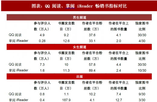阅文作为网文鼻祖,纯网文内容优势非常突出,主要体现在内容丰富度、积累深度及互动性等方面:(1)独家图书比例:不管是男频还是女频网文,阅文畅销作品均为独家连载,并不向其他主流小说平台进行分发授权;而掌阅的纯网文大部分为交叉授权作品,独家比例极低。(2)参与评分人数×书圈发言数目:男生频道畅销书,QQ 阅读为 iReader 的 13 倍;女生频道畅销书,QQ 阅读为 iReader 的 4 倍。(3)作者在平台上的图书数量:QQ 阅读畅销书作者在平台上约有 4 本正在连载或连载完成,约为 iReader 的 2 倍。