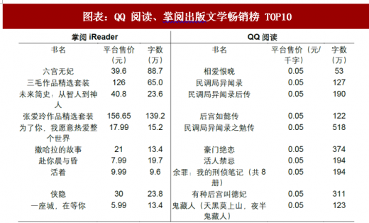 在出版文学畅销榜单上,两个平台呈现明显差异,掌阅在经典文学上受众更多。QQ 阅读的出版文学在风格上基本与网文接近,属于畅销文学类;而掌阅出版频道中,排在畅销榜前列的绝大部分为经典文学且在纸质出版渠道也均为畅销作品,例如《三毛作品精选》、《张爱玲作品精选》、《活着》、《未来简史》等。我们认为,出版类图书畅销榜单风格的差异一定程度上反映出掌阅在纯网文内容存在短板的情况下,倚重出版图书作品版权进行差异化破局的意图。