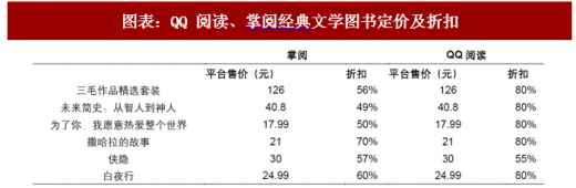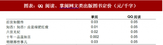 两大平台定价差异在于出版类图书。对纯网文,目前全平台基本按照 0.05 元/千字进行收费;而掌阅 iReader 和 QQ 阅读出版类图书定价存在不同。(1)针对经典文学图书,例如《三毛作品精选套装》、《撒哈拉的故事》、《白夜行》等,掌阅和 QQ 阅读均按照单本定价,但掌阅的折扣率普遍低于 QQ 阅读;(2)针对偏网文类出版图书,如《后宫如懿传》、《明朝那些事》、《六宫无妃》等,掌阅定价方式兼具按本定价和按千字收费,但定价相比 QQ 阅读普遍更低。