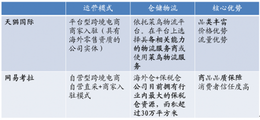 天猫国际和网易考拉作为市场份额占比前两位的跨境电商巨头,也代表了目前跨境电商的两大运营模式:具有流量优势的平台型跨境电商模式和自营型跨境电商。