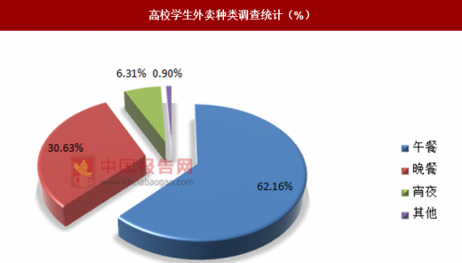 对于校园外卖的种类,午餐和晚餐占据着主导地位,分别高达62%和31%,此外还有6%的学生会点宵夜外卖。