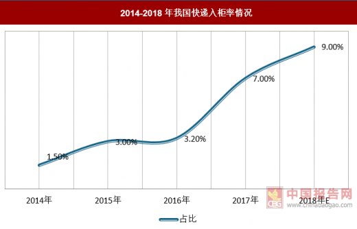 2017年底,国内已投放beplay下载软件 快递柜数为20.6万组,较2016年增加-倍以上,通过beplay下载软件 快递柜投递快件占投递总量7%,同比提高了近4个百分点。根据国家邮政局2018年的工作计划,beplay下载软件 快递柜(信报箱)箱递率将提高2个百分点。2020年,快递入柜率有望达到15%,按2017年单柜的效力计算,77.2万组beplay下载软件 快递柜才能满足配送需求。