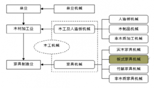 板式家具机械制造业的上游包括标准零部件、电气件、机械加工件、金属型材生产等行业,下游主要为家具制造业。板式家具机械作为制造板式家具的专用木工机械设备,其行业发展与人造板技术的发展、数控加工技术的应用以及终端家具消费市场需求等因素有密切的关系。