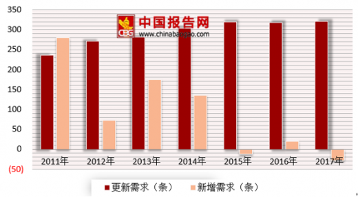 此外,按照目前建筑陶瓷生产线的平均使用寿命约为8年估算,每年约有12.5%的原有产能生产线更新需求。以2011年为例,全国建筑陶瓷产量约为87亿平方米,则2012年约有10.88亿平方米产能的建筑陶瓷生产线存在更新需求,按行业目前单条生产线的设计产能400万平方米/年计算,2012年全国建筑陶瓷生产线更新需求约为272条。类似的,2013年生产线更新需求约为281条;2016年生产线更新需求约为318条,2017年为321条。