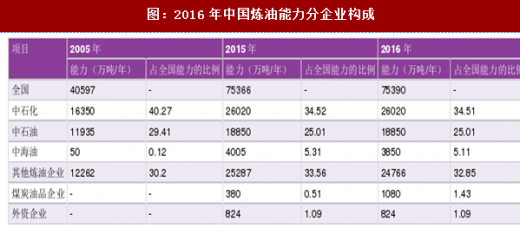 截至2016年底,中国炼油能力为7.5亿吨/年,较2015年净增炼油能力24万吨/年,基本持平。其中,新增炼油能力2110万吨/年,淘汰炼油能力2086万吨/年。在7.5亿吨的总体炼油能力中,千万吨级炼厂数量达到了25座,合计炼油能力3.2亿吨,占国内炼油能力的42.7%。