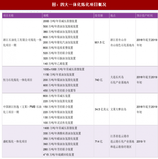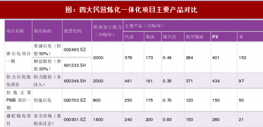 民营四大炼化一体化项目中,浙石化一期、恒力、盛虹的项目原油加工能力及投资额基本相当;恒逸的文莱项目一期原油加工能力相对较小,但在文莱具有资金、成本优势及税收优惠,该项目也是恒逸集团进军海外的敲门砖。