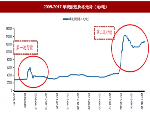 2015-2017年:2015年国内新能源汽车尤其大巴车销量迅速拉伸,在中美欧等国家和地区政策支持下全球新能源汽车销量再创新高,对碳酸锂的需求量大幅提高,同时上游资源瓶颈尚存,加工产能相对集中,全球碳酸锂加工厂商受限于上游原材料不足和产能不足,导致碳酸锂价格继续上升。