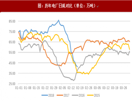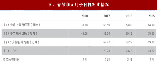 从历史数据来看,电厂日耗从除夕前3天开始进入“放假”模式,从正月初十左右慢慢回升,元宵节(正月十五)后逐步回至常态,3月份日耗保持相对稳定。2015-2017年,3月份电厂日耗均值相较春节期间差值均在20万吨以上,叠加今年3月采暖季结束后下游复产预期,预计3月份电厂日耗均值在66万吨以上。