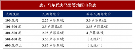 马尔代夫柴油发电成本高,居民电价与成本倒挂。当前马尔代夫柴油发电成本为 0.3 美元/千瓦时,高于世界平均风力发电的成本与光伏发电成本。因此马尔代夫的电价较高,居民用电价格和电力生产成本仍然倒挂(马尔代夫国家电力公司每天亏损额达 25000 美元)。2009 年 11 月,马尔代夫国家电力公司上调马累、乎鲁马累等四岛电价,民用电使用量在 100 度内电价由 1.6 卢菲亚/度上涨到 2.25 卢菲亚/度(约合 17.6 美分/度),上涨幅度达 40%,但仍无法弥补柴油发电机供电的成本 0.3 美元/度。