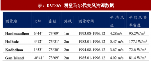 马尔代夫季风气候风力资源禀赋高。马尔代夫受季风气候影响,北部地区季风特征比较明显,6 月~9 月为西南季风,12 月~2 月为东北季风;根据马尔代夫气象局 2002 年的风资源数据,马尔代夫最佳的风资源位于南北 Maalhusmadulu、南北 Miladhunmadulu 和 Faadippolhu 环礁等地,该地区也是马尔代夫东北季风最盛行的地区。从该地区向南和向北 50 公里内,风资源次之,马累在此之列。其他地区从马累往南风资源逐渐减少,至Gan岛附近风资源最小,但从数值来看仍在“可开发”类别。