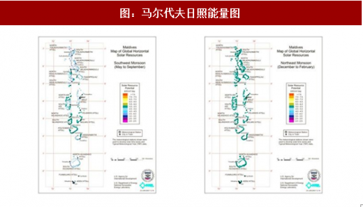 非季风期马尔代夫太阳能资源丰富,与风力形成季节性互补。阳光是马尔代夫气候的主要特色,年平均每日每平方米水平照射能量为 5~5.5 千瓦时,南方环礁每年大约 2700 小时受阳光照射。综合考虑马尔代夫风能和太阳能的季节性特征,可以发现二者相辅相成:季风期,日照水平较低而风能较强;非季风期正好相反。因而,互补利用这两种可再生能源,可以解决任一能源的季节性短缺问题。