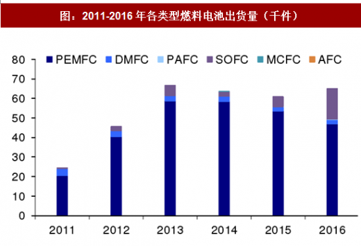 根据E4tech统计数据, PEMFC是目前最主要的燃料电池类型,2016年出货量占全部燃料电池出货量的71.93%,兆瓦出货量占全部燃料电池出货量的65.02%。三种使用铂系催化剂的燃料电池出货量合计占总出货量的75.46%,兆瓦出货量占总出货量的74.80%。