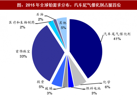 欧洲是目前全球铂族金属消费的主要地区之一,汽车尾气催化剂是欧洲铂族金属消费的主要领域,虽然近年来,欧洲汽车市场尤其是柴油车市场不景气,产量下滑,导致铂消费量下降。不过在中国,铂主要用于制作首饰,而在汽车领域铂金消费量一直处在较低水平,2015年首饰铂的消费量占我国铂消费总量的75%,而汽车尾气催化剂用铂仅占6%。