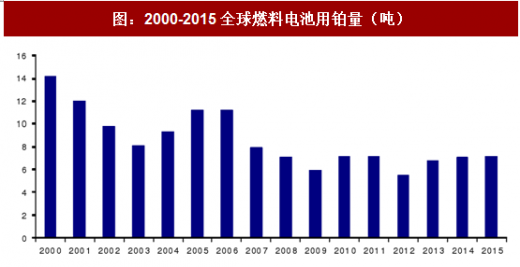 铂金属在交通运输的应用主要是作为催化剂。传统汽油、柴油汽车尾气催化剂是铂一直以来最重要的工业应用之一,目前依然保持巨大的份额。据庄信万丰统计数据,汽车尾气催化剂需求在2015年达到106.7吨,同比增长5.85%,全球占比达到41%,是目前最大的下游需求领域。