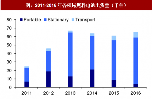从目前三种燃料电池出货量比例来看,随着新能源汽车产业的迅速发展,交通运输领域燃料电池正占据越来越高的比例。据E4tech统计,2016年兆瓦出货量已经超过了固定式电源。