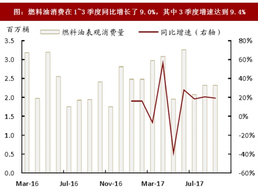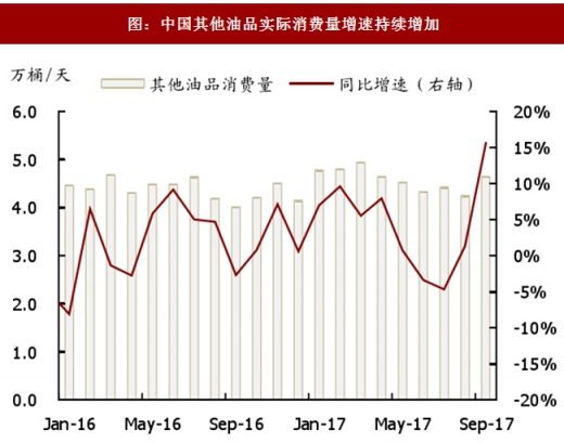 3季度,沥青油品消费受到公路建设投资提振,需求增速继续回升;其他油品需求也一转2季度负增长的颓势,转向两位数增长。3季度,国内沥青实际消费同比增速达到了23.2%。2017年1}3季度同比增速达到11.6%,大幅高于2016年的1.3%。沥青消费量的大幅增加主要收到公路建设的推动:根据交通运输部公布的数据,3季度用于公路建设的固定资产投资额同比增长了17.3%}1}3季度同比增长了23.9%,较2016年同比增速的7.7%显著提升。