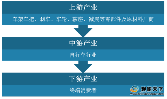自行车行业产业链上游主要为包括车架车把、刹车、车轮、鞍座、减震等零配件和原材料的生产制造企业,下游则销往终端消费者。由于其生产门槛较低,发展时间久,市场竞争激烈,供给充足,行业内目前发展稳定,消费饱和。