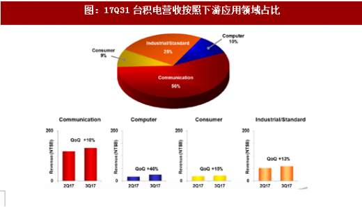 从下游应用来看,17Q3台积电营收按应用分布为:通信(56%)、工业/标准品(25%)、计算机(10%)、消费(9%)。从下游领域的营收环比增长来看,计算机环比增长46%、消费环比增长15%、工业/标准环比增长13%、通信环比增长10%。