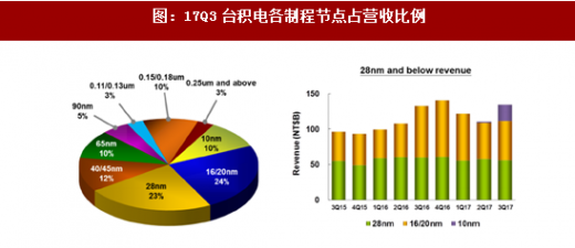 摩尔定律继续演进,28纳米及以下制程技术节点占营收比重大。从制程节点占收入比例来看,17Q3台积电28纳米及以下制程技术占总营收比例创下今年以来新高:16/20纳米、28纳米、40/45纳米、10纳米、65纳米、0.15/0.18微米分别占总营收的24%、23%、12%、10%、10%、10%。