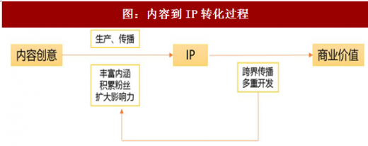 内容产品在生产和传播的过程中,不断丰富自身文化内涵、积累用户群体(粉丝),在自身影响力不断扩大的过程中成为经过市场验证的情感载体,法律上的保护实现了内容的版权化(IP的本意即知识产权),从而最终实现了从内容到IP的转化。