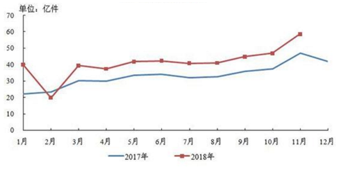 根据数据显示,国家邮政局在12月11日公布了2018年11月邮政行业运行情况。根据显示,11月我国快递服务企业业务量完成58.6亿件,同比增长24.4%;业务收入完成648.3亿元,同比增长14.6%。1-11月我国快递服务企业业务量累计完成452.9亿件,同比增长26.3%;业务收入累计完成5428.8亿元,同比增长22.3%。