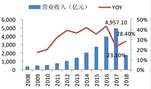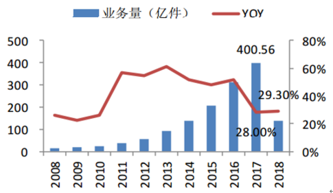 2017年,快递行业虽然仍保持较快增长,但增速较2016年有较大幅度下滑。全年,规模以上快递业务量400.56亿件,同比增长28%;快递业收入4957.10亿元,同比增长23.10%。到2018年前4个月,快递业两项指标增速双双回升,快递业收入增长28.40%(+2.3pct),快递业务量增长29.30%(-0.5pct),为全年行业增长奠定良好基础。
