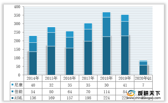 从销售量来看,2014-2018年,全球光刻机Top3企业销售量呈现波动增长的态势,2019年有所下滑,销售量为354台,同比下降3.8%。截止到2020年Q1,全球Top3企业销售量实现85台。