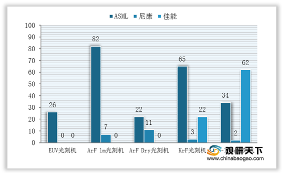 目前,市场上销售的光刻机主要产品分为五大类:EUV光刻机、ArF lm光刻机、ArF Dry光刻机、KrF光刻机和i-line光刻机。其中,i-line光刻机出货最多。数据显示,2019年在上述五类光刻机产品销售量情况中,i-line光刻机出货量为116台,在这116台中,Canon公司贡献了一半以上。