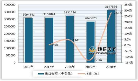 从出口金额来看,2020年,我国自行车出口金额为3647576千美元,较上年增长800756千美元,同比增长28.1%。