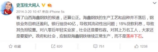 2014年3月,海鑫集团事件发酵时,史玉柱在微博上发声,表示“海鑫钢铁的生产工艺和品种并不落后”,同时还给出几点希望,其中就包括“对八零后年轻实业家,社会还是要包容。”