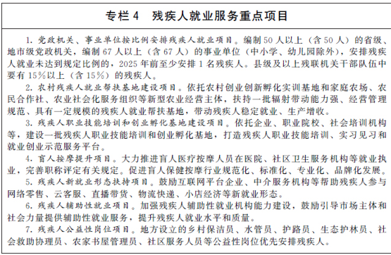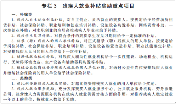 帮扶城乡残疾人就业创业,帮助残疾人通过生产劳动过上更好更有尊严的生活。多渠道、多形式促进残疾人就业创业。开展残疾人就业促进专项行动。对正式招录(聘)残疾人的用人单位按规定给予岗位补贴、社会保险补贴、职业培训补贴、设施设备购置改造补贴、职业技能鉴定补贴等扶持,对超比例安排残疾人就业的用人单位给予奖励。为残疾人特别是聋人参加职业技能培训、就业创业提供无障碍支持服务。支持手工制作等残疾妇女就业创业项目,鼓励残疾人参与文化产业。扶持残疾人亲属就业创业,实现零就业残疾人家庭至少有一人就业。